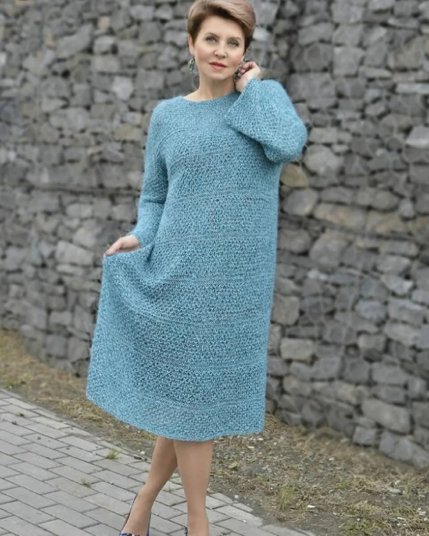 Вязаное спицами женское платье «Лазурный океан» — HandMade