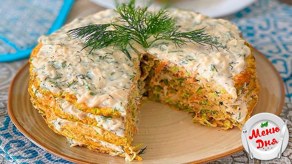 Кабачковый тортик Ингредиенты Для блинчиков: 3 яйца 600 гр кабачков 1 средняя морковь 110 гр муки (у меня 2 ст.л рисовой и 2 ст.л пшеничной цельно зерновой) Сухой чеснок Соль, перец по вкусу Для прослойки: 300 гр густого йогурта в баночке 100 гр натертого на средней терке сыра Сухой чеснок Укроп Соль, перец по вкусу Пошаговый рецепт приготовления 1.Кабачки натираем на крупной терке, морковь — на средней, даём им постоять 5-10 минут 2.Хорошенько их отжимаем 3.Добавляем к овощ