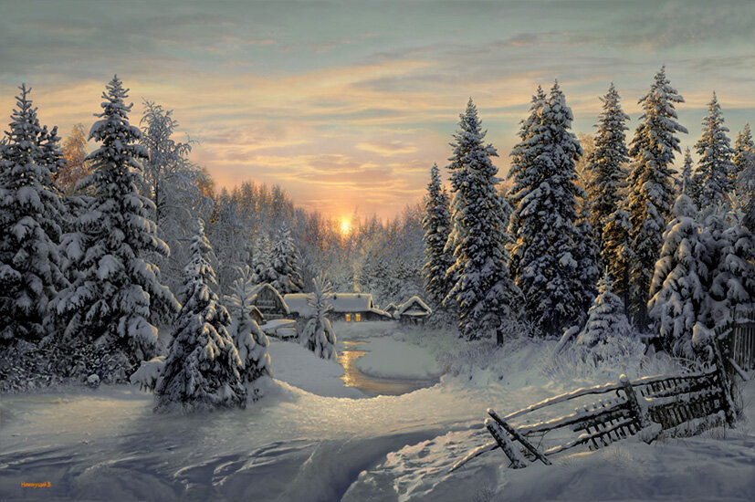 В чертогах матушки Зимы. В чертогах матушки ЗимыПритихли буйные метели.Снег повалил, как из сумы,Одев манто с утра на ели.