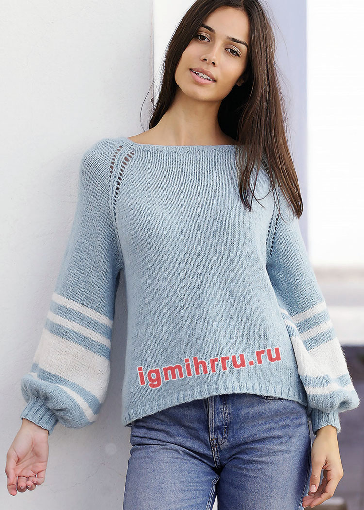 Голубой пуловер с белыми полосами на рукавах. Вязание спицами со схемами и описанием