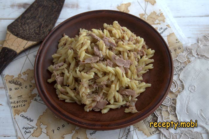 Макароны с тунцом консервированным и луком ✅Ингредиенты тунец консервированный – 1 банка; макароны – 250 граммов; соль – по вкусу; масло для жарки – 2 ст.л; щепотка чили; лук – 0,5 шт.
