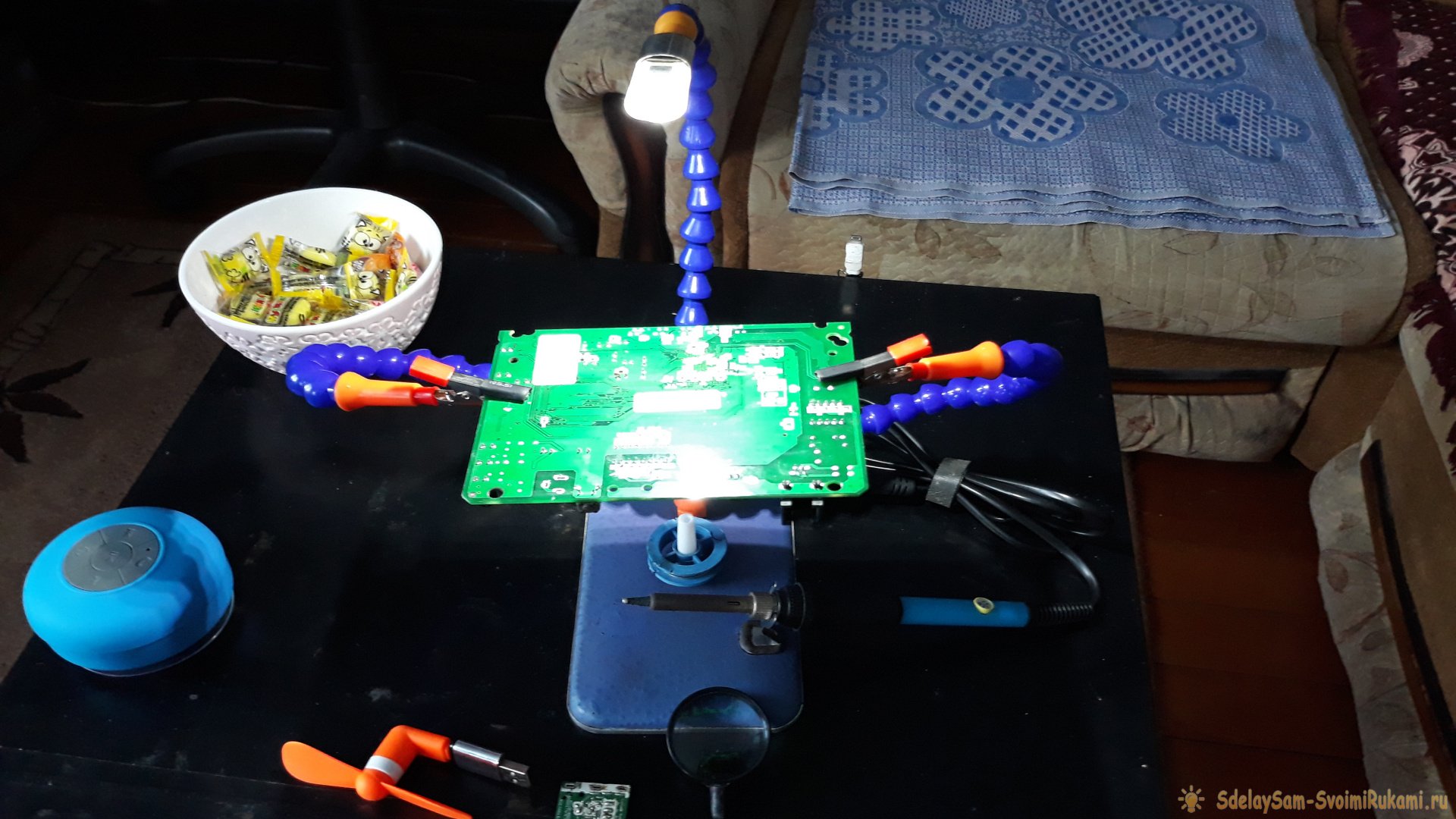 Как недорого собрать держатель третья рука с лупой, подсветкой и вентилятором Хороший держатель для пайки (она же – «третья рука»), с тремя, четырьмя, или даже шестью гибкими держателями, стоит недёшево. Самый дешёвый держатель, более-менее приличный, которую я нашёл в интернете, стоит около 2,5 т.р. Деньги эти, конечно, не такие уж и большие, в наше время, но зачем их