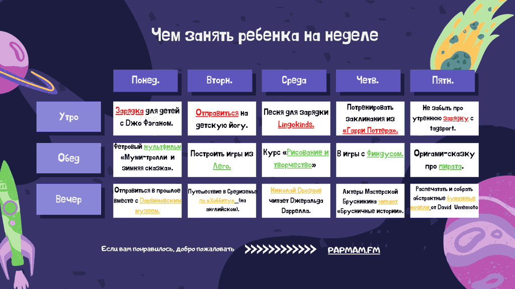 Интерактивный План занятий с детьми на неделю №2 План небольших развлечений на всю неделю с утра и до вечера.Перейдя по интерактивным ссылкам, ребенок получит задание и у вас будет немного времени попить чай или кофе, а может немного отдохнуть.