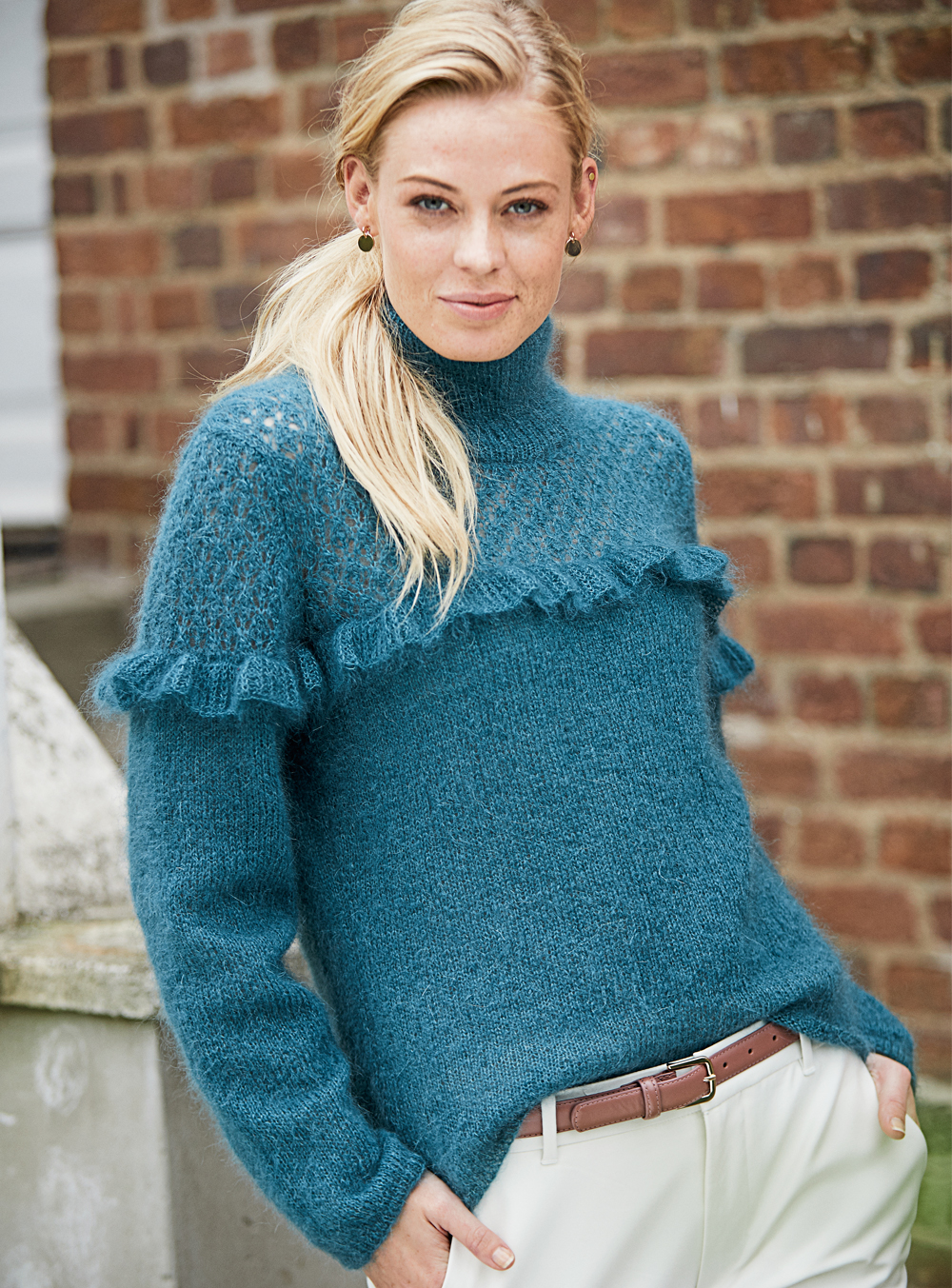 Темно-бирюзовый свитер с рюшами — схема вязания спицами с описанием на BurdaStyle.ru