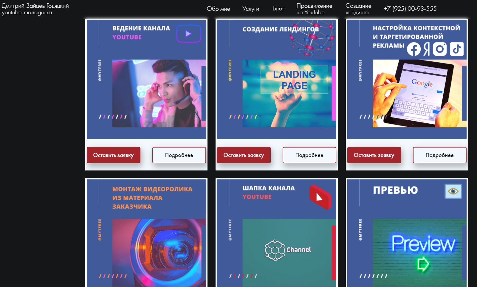 Менеджер YouTube каналов и Таргетолог Дмитрий Зайцев Годяцкий Ведение и продвижение ютуб каналов Создание сайта, интернет-магазина и лендинга под ключ Монтаж видео для Youtube канала Шапка ютуб канала Превью (обложка видео) для Youtube канала
