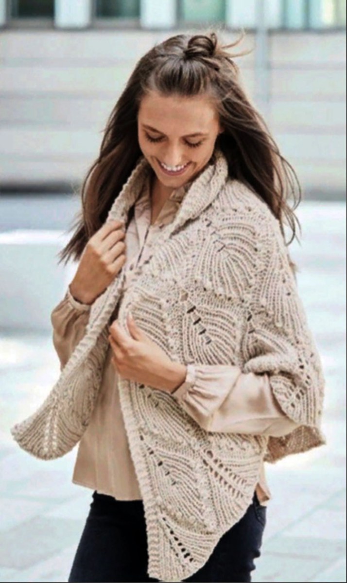 Вязаная шаль спицами с крупным узором (Вязание спицами) Красивый узор из листьев и «шишечек» прекрасно подходит для этой современной стильной и теплой шали. РАЗМЕР Верхний край = ок. 180 см, высота в середине = 73 см ВАМ ПОТРЕБУЕТСЯ Пряжа (78% натур…
