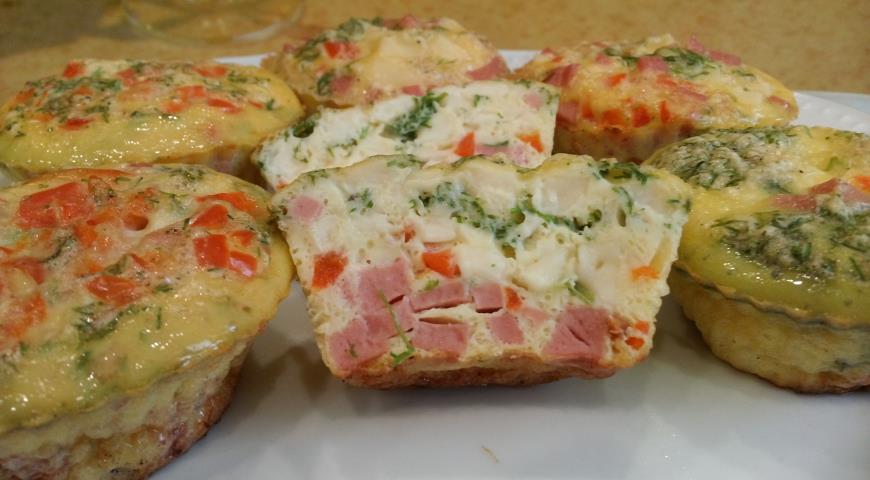 - ПОШАГОВЫЙ РЕЦЕПТ ПРИГОТОВЛЕНИЯ Шаг 1 Приготовьте продукты. Шаг 2 Сыр, перец, колбасу, укроп - мелко нарежьте. Шаг 3 Яйца посолить, поперчить, добавить зелень - перемешать венчиком. Шаг 4 В формочки выложить продукты. Шаг 5 Залить яичной смесью до верха. Шаг 6 Поставить выпекаться на 20 минут при 16\80 градусов. Шаг 7 Приятного аппетита.