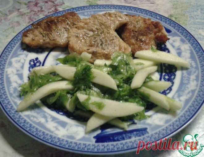 - ГОТОВИМ САЛАТ: 1. Медовая заправка: В маленькой глубокой тарелочке смешать мёд, лимонный сок, соль и перец, добавить подсолнечное масло. Интенсивно перемешать венчиком. 2. Салат: Тщательно промыть листья салата, нарезать и сложить в миску. Яблоко разрезать, убрать сердцевину и кожуру; нарезать тонкими полосками, положить в миску и перемешать с листьями салата. Заправить медовой заправкой салат, перемешать и убрать в холодильник.