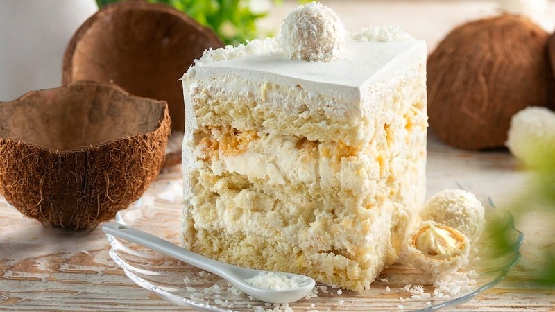 Кокосовый торт Рафаэлло 🥥🍬 Рецепт вкусного торта с кокосовыми коржами, кремом со сливками и маскарпоне, белым шоколадом и хрустящим слоем - нежный тающий во рту... #тортРафаэлло