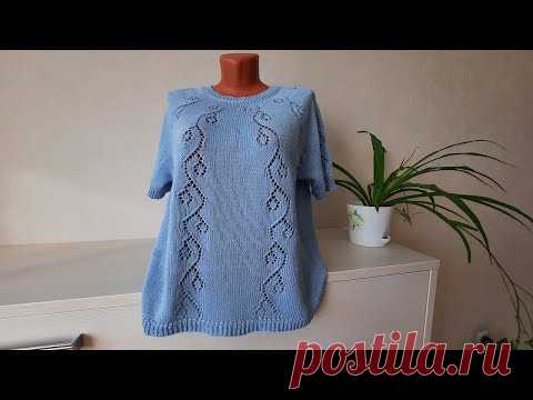 Готовая работа. Джемпер Голубой с круглой кокеткой.// Обзор изделия, прибавки на кокетке.//