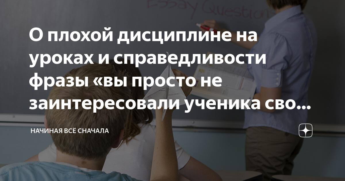 О плохой дисциплине на уроках и справедливости фразы «вы просто не заинтересовали ученика своим предметом» Фразу «если ученик плохо ведёт себя на уроках, значит учитель не заинтересовал его своим предметом» можно встретить много где и от разных людей, начиная чиновниками и заканчивая родителями. Справедливость этой фразы вызывает вопросы, так как не только учитель отвечает за дисциплину на уроке.