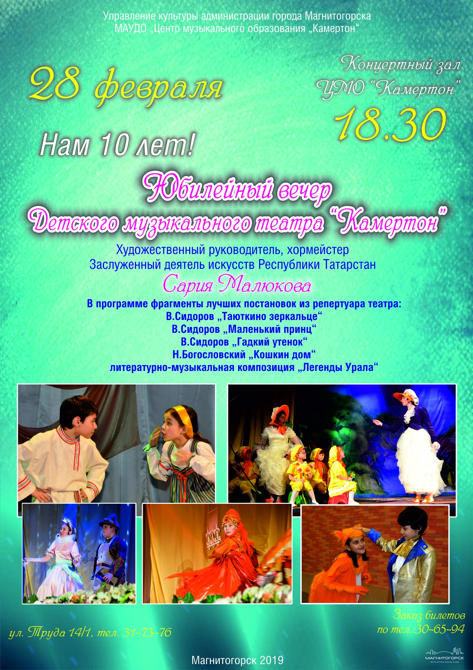 Юбилейный концерт, посвященный 10-летию детского музыкального театра «Камертон» 28 февраля 2019 года. Фрагменты музыкальной были «Таюткино зеркальце», мюзикла «Гадкий Утенок», литературно-музыкальной композиции «Легенды Урала», музыкальной сказки «Кошкин дом» и оперы-сказки «Маленький Принц».