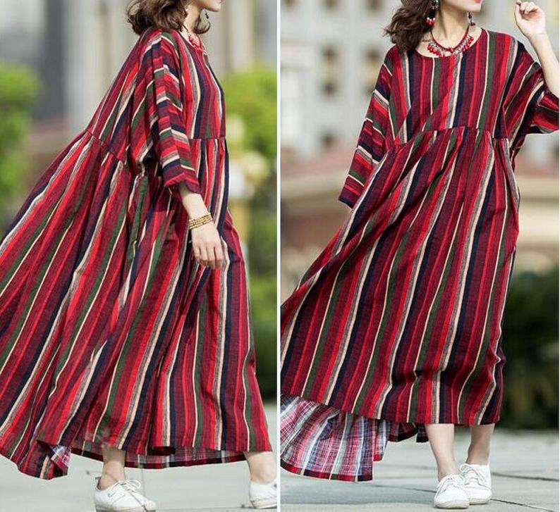 Red Cotton Striped Dress travel long dress Plus Size dress | Etsy