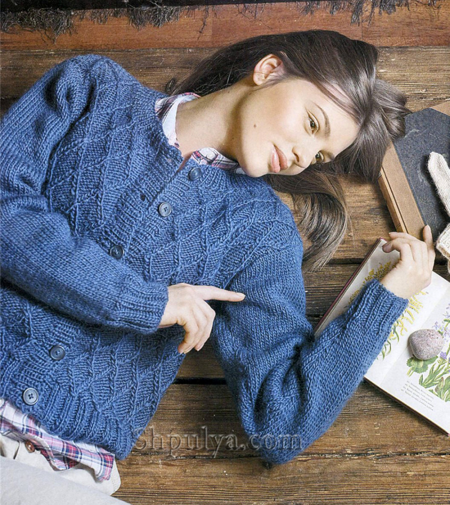 Синий вязаный жакет на пуговицах спицами — Shpulya.com - схемы с описанием для вязания спицами и крючком