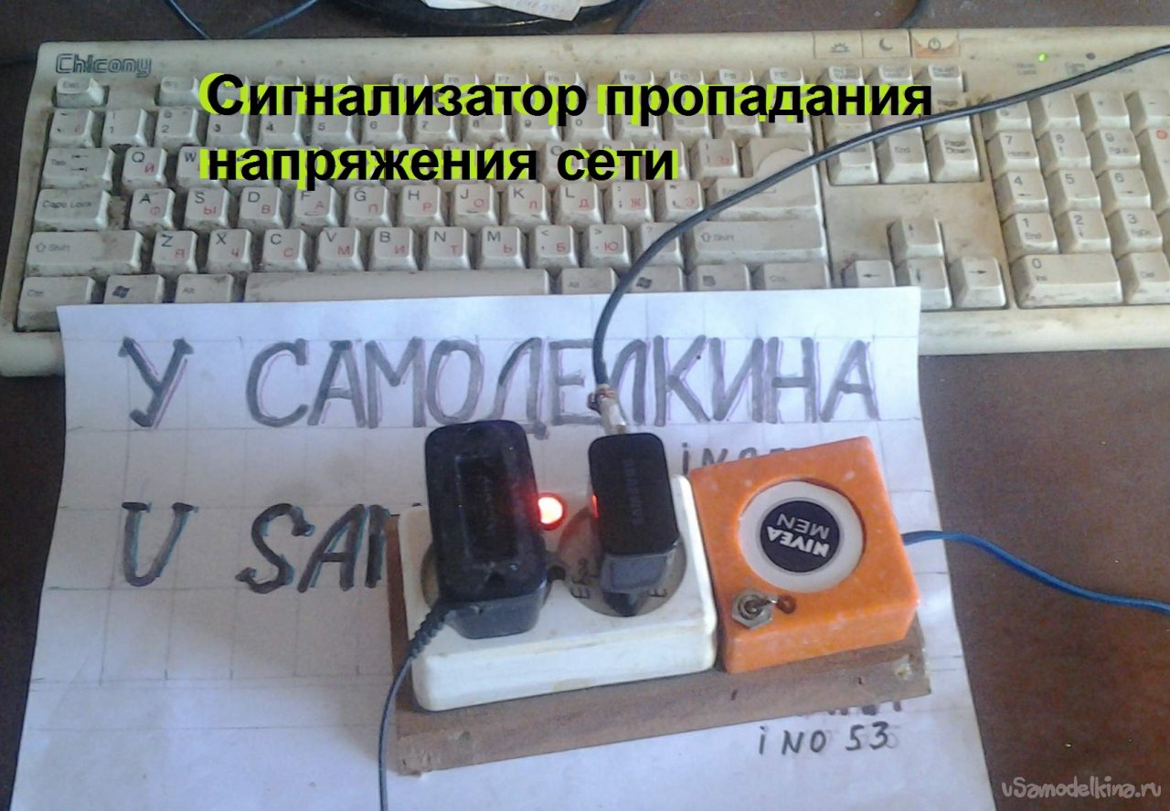Сигнализатор «пропадания» сети Этот сигнализатор был изготовлен по заказу как приставка к удлинителю, в который включаются переносные устройства для зарядки их аккумуляторов (АКБ). При отсутствии напряжения в сети (или ошибочном отключении из розетки) он раз в несколько секунд издает кратковременный противный писк. С