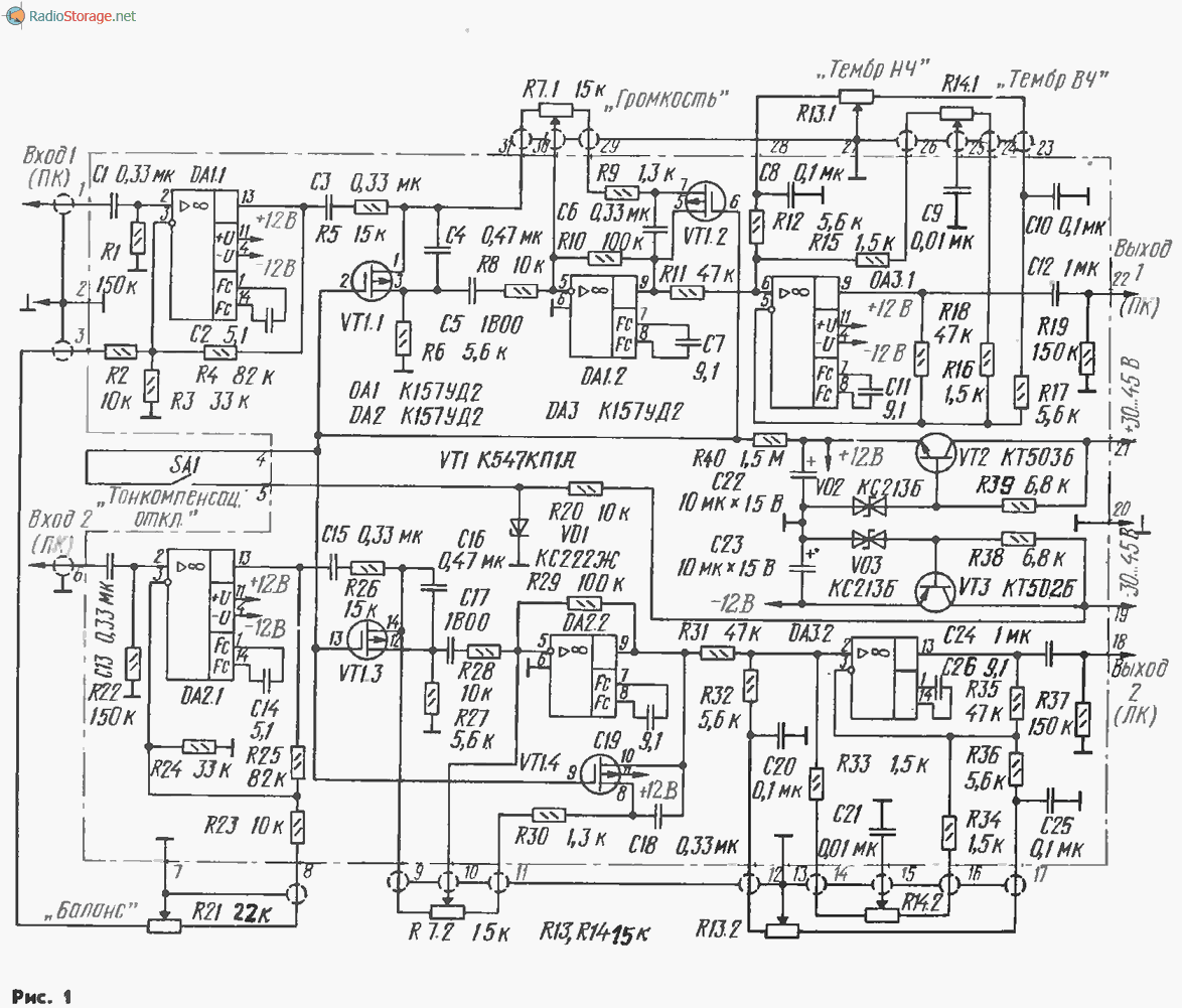 Высококачественный регулятор громкости и тембра (К157УД2, К547КП1) Схема высококачественного регулятора громкости, баланса и тембра для УМЗЧ высокой верности.