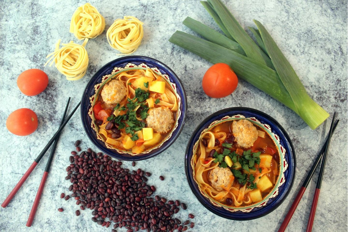 Азиатский суп с фрикадельками, лапшой и фасолью