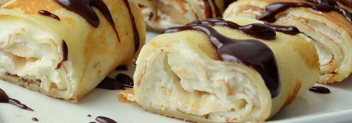 Рулеты из блинчиков с кремом • Рецепт Очень нежные и вкусные рулеты из блинчиков с творожно-банановым кремом и шоколадным соусом.