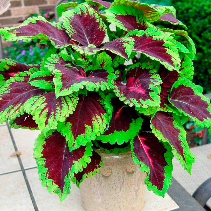 Комнатное растение Колеус (Coleus). Многолетнее неприхотливое травянистое растение семейства Губоцветные высотой около 35-70 см. Колеус выращивают из-за его пестрых расписных листьев, напоминающих листья кротона, - они не теряют своей декоративности в течение круглого года. Обычно колеус культивируют как однолетнее растение, которое легко выращивается из семян или черенков. Цветение начинается поздней весной или летом. Цветки мелкие, голубоватые, собранные в колосовидное соцветие.