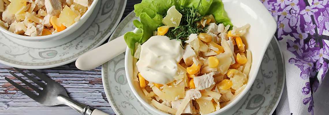 Салат «Ананасовый рай» с курицей • Рецепт Сытный и одновременно легкий салат «Ананасовый рай» с курицей. Отварное куриное филе, сыр, консервированный ананас и кукуруза делают его очень вкусным.