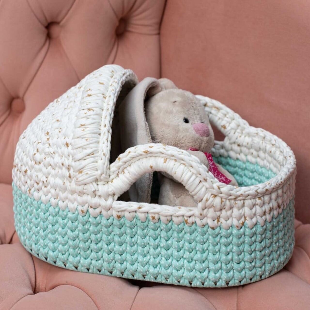 Tatiana Корзинки Люлечка для куклы. Связана из трикотажной пряжи Arachna. Деревянное дно с глянцевым защитным покрытием Diamond Shine. Внутренние размеры: 19 х 29 см Высота борта 10 см Высота с капюшоном 18 см