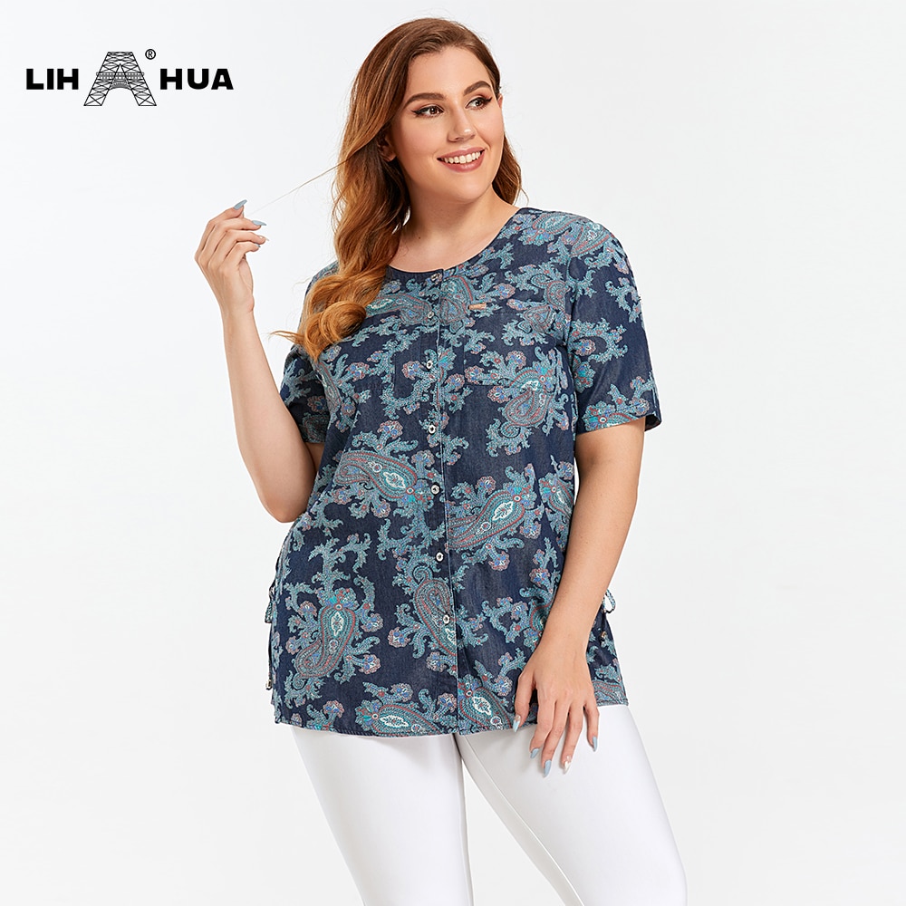 1779.6руб. 58% СКИДКА|Женские джинсовые топы LIH HUA, летняя рубашка, Повседневная рубашка с рукавами и принтом, тканая джинсовая рубашка с коротким рукавом и поясом|Футболки| | АлиЭкспресс Покупай умнее, живи веселее! Aliexpress.com