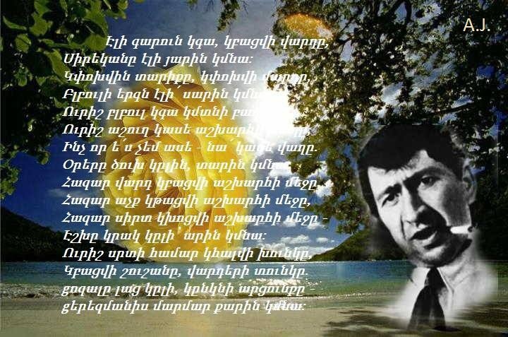 Ե.Չարենց Էլի գարուն կգա,կբացվի վարդը Սիրեկանը էլի յարին կմնա: Կփոխվին տարիքը,կփոխվի մարդը Բլբուլի երգն էլի՛սարին կմնա: Ուրիշ բլբուլ կգա կմտնի բաղը, Ուրիշ աշուղ կասե աշխարհի խաղը Ինչ որ ե՛ս չեմ ասե-նա՛կասե վաղը Օրերը ծուխ կըլին,տարին կմնա Հազար վարդ կբացվի աշխարհի մեջը Հազար աչք կթացվի աշխարհի մեջը, Հազար սիրտ կխոցվի աշխարհի մեջը Էշխը կրակ կըլի՝արին կմնա: Ուրիշ սրտի համար կհալվի խունկը Կբացվի շուշանը, վարդերի տունկը Գոզալը լաց կըլի,կընկնի արցունքը Գերեզմանիս մարմար քարին կմնա