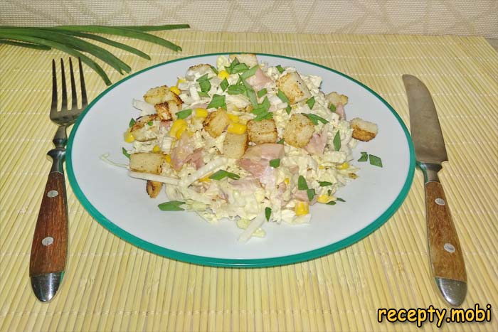 Салат «Моя прекрасная леди» с пекинской капустой ✅Ингредиенты копчёная курочка, колбаса или ветчина – 150-200 г; капуста пекинская – 200-250 г; кукуруза консервированная – 150 г; сухарики домашние – 3 ломтика батона; чеснок – 1 зубчик; соль – по вкусу; растительное масло – 1-2 ч. л; лук зелёный – для украшения; майонез – по вкусу.
