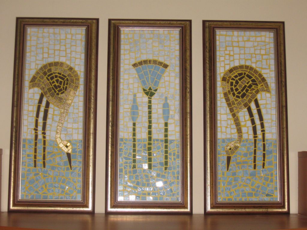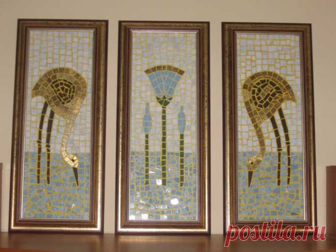 "журавли и лотос" – купить на Ярмарке Мастеров – 29FNRU | Картины, Москва "журавли и лотос" в интернет-магазине на Ярмарке Мастеров. Работа состоит из 3-х частей. Рисунок -элементы греческого и египетского орнаментов. Птицы выложены золотой плиткой.