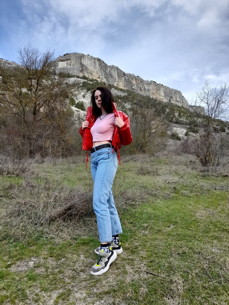 Взяла у подруги красную куртку, чтобы одеться ярче. Показываю мой весенний образ с джинсами и топом