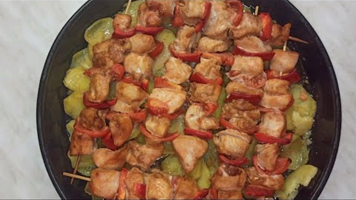 Как приготовить вкусные шашлыки из курицы в духовке.Куриный шашлык на шпажках с картошкой