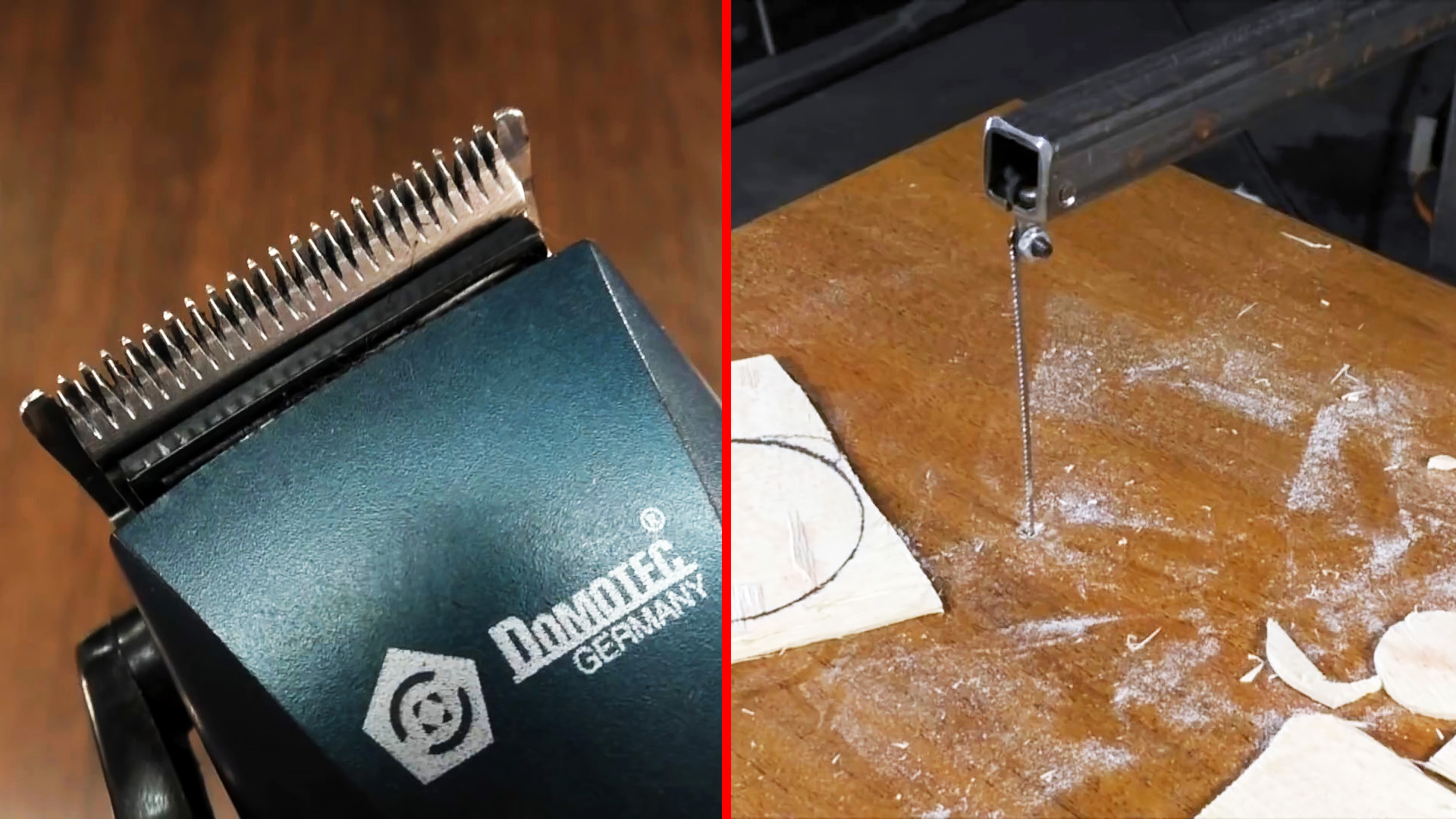 Как из машинки для стрижки сделать лобзиковый станок Старая электрическая машинка для стрижки волос с изношенными ножами может получить вторую жизнь, достаточно сделать на ее базе лобзиковый станочек. Он пилит тонкие листовые материалы полотнами от ручного лобзика, поэтому позволяет делать очень тонкий точный рез. Такой станок будет полезным