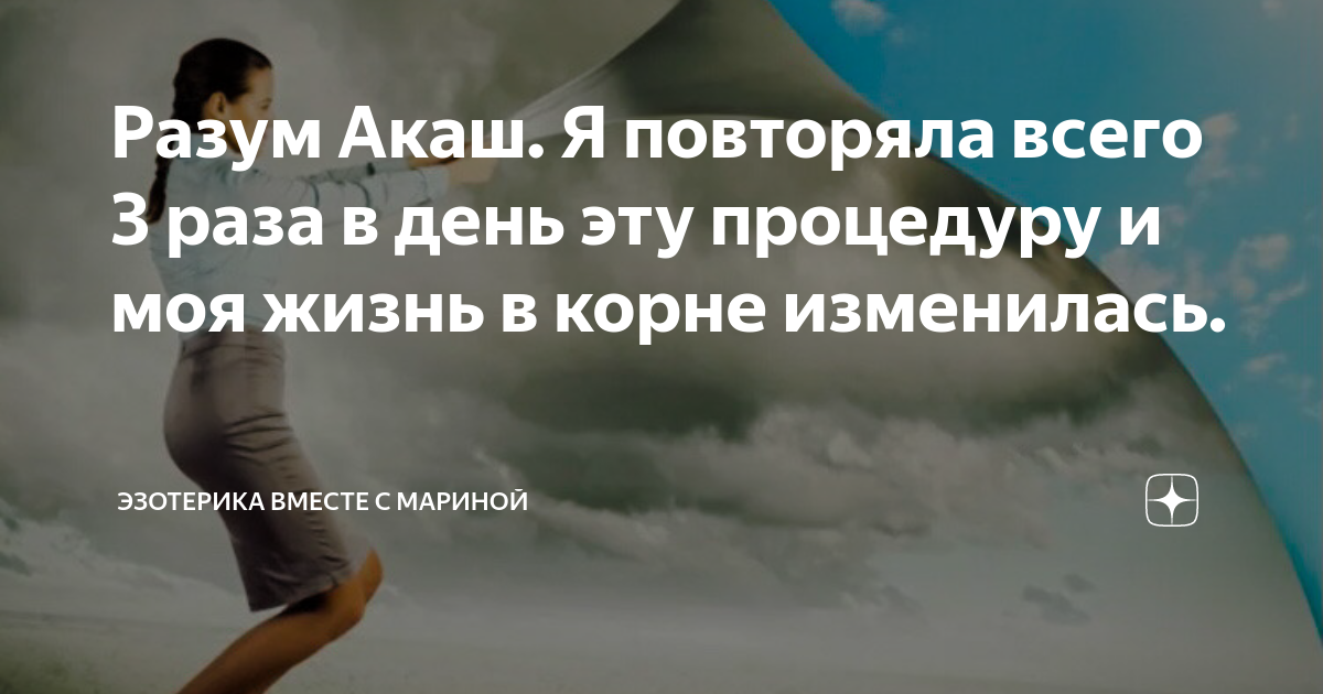 Разум Акаш. Я повторяла всего 3 раза в день эту процедуру и моя жизнь в корне изменилась. Характер жизни человека определяется довольно простым уравнением, в котором важнейшим элементом является разум. От того, работает он на человека или против него и будет зависеть удовлетворенность жизнью в целом. Среди индийских практик существует одна интересная методика, которая не требует особых навыков или знаний. Тем не менее, уделяя этой практике совсем немного времени, можно дов...