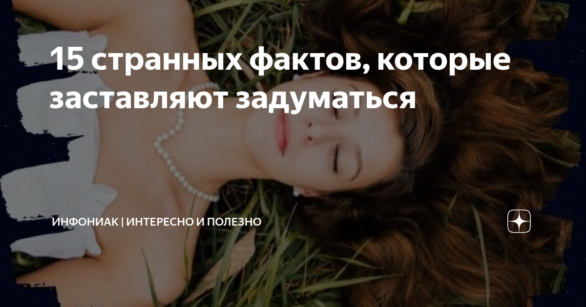 15 странных фактов, которые заставляют задуматься 1. В 1977 году мы получили радиосигнал из космоса, который длился 72 секунды. Ученые до сих пор не разгадали, что он означает. 2. Женщина из Колумбии однажды вынашивала окаменевший плод больше 40 лет. 3. После еды сердце темного тигрового питона становится примерно на 40 процентов больше. 4. Генетический состав кукурузных хлопьев намного сложнее, чем у человека. 5. Когда мы умираем во сне, мы просыпаемся, потому что мозг н...