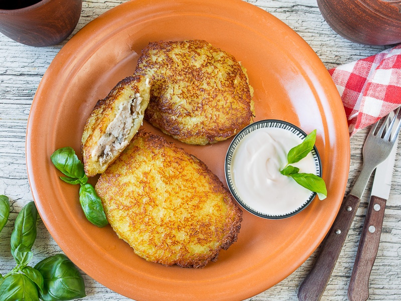 Драники с курицей и грибами Ингредиенты (на 4 порции):Основа:картофелина средняя – 8 шт.луковица средняя – 1 шт. соль по вкусу