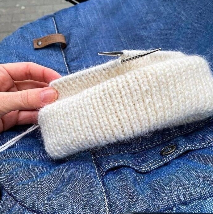 5. Вяжем резинкой нужную длину. Связав подворот и ещё немного, я обычно меряю шапку, подтянув спи...