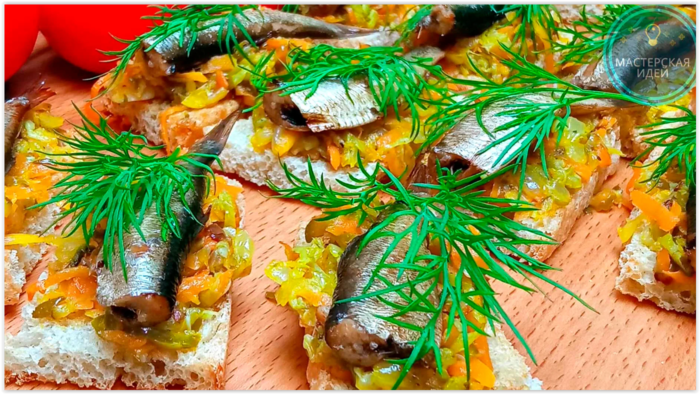 Обжариваю солёные огурцы с луком и морковью, открываю шпроты и готовлю самые вкусные закусочные бутерброды