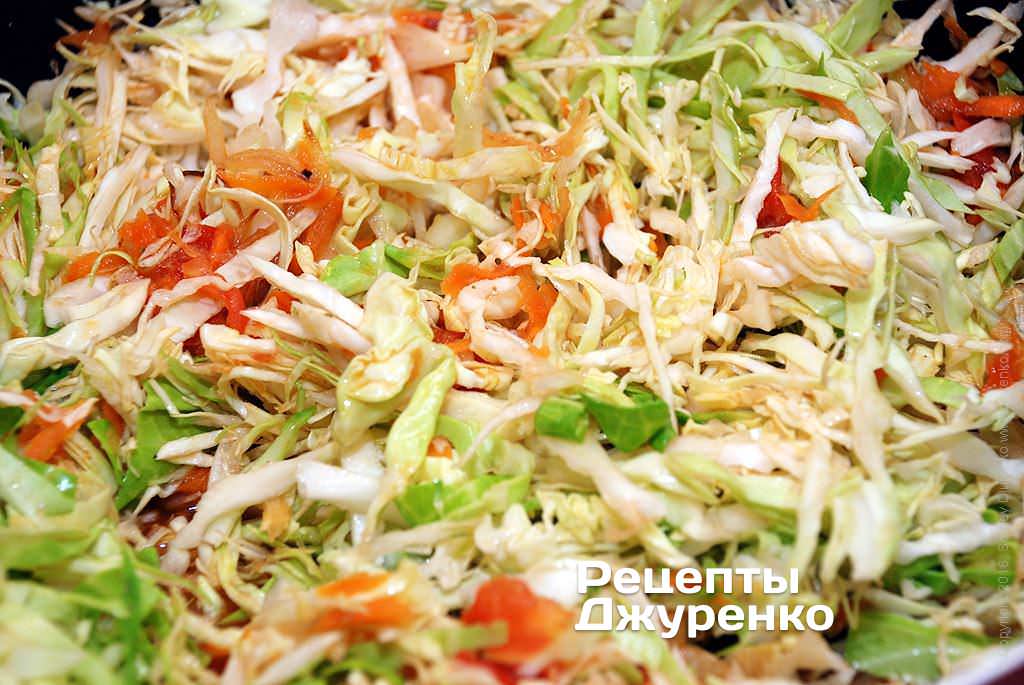 - Перемешать овощи и пусть капуста тушится еще 10 мин.