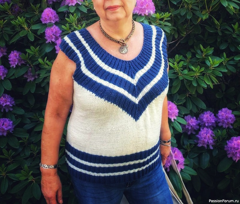 Топ-майка в морском стиле | Вязание спицами. Работы пользователей Связала летнюю майку или топ из норвежcкoй пряжи "Cotton medi" -100% хлопок (50гр/ 100м). Из хлопка вязала спицами впервые, не считая нескольких шапок. Вдохновением для меня стал МК на YouTube "Шикарный вязаный топ спицами " от Творческая мастерская. Эту идею я изменил на под...