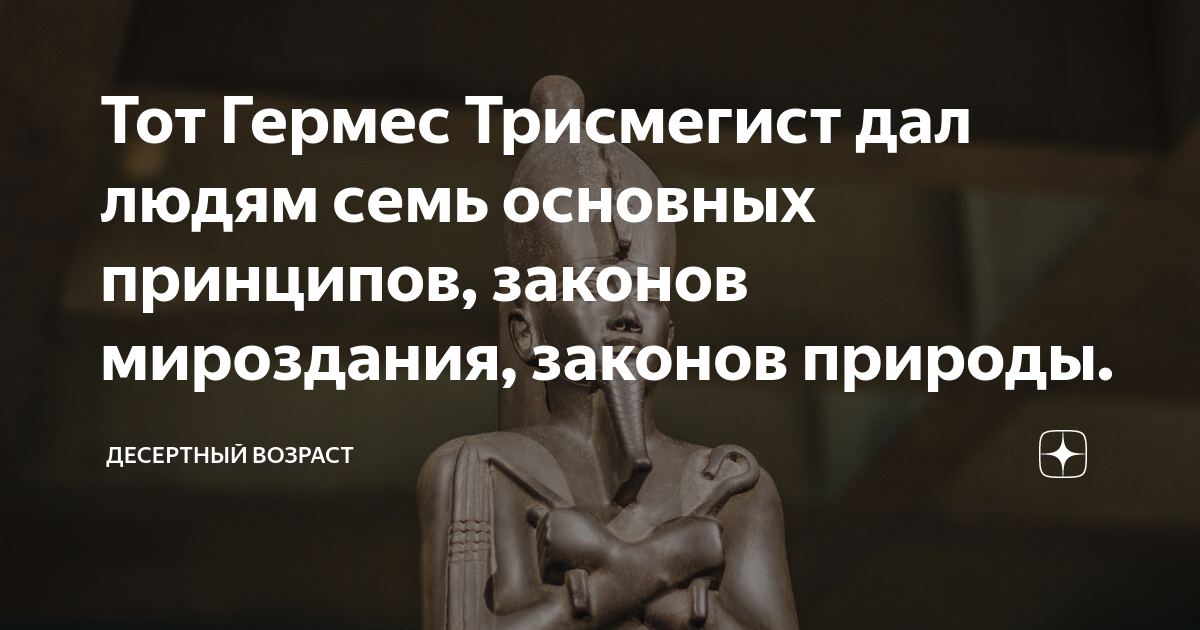 Тот Гермес Трисмегист дал людям семь основных принципов, законов мироздания, законов природы. Тот Гермес был обожествленным царем Египта. Историк и жрец Манефон называет эту эпоху царствованием Богов. Он обладал тайным учением, наследием цивилизации погибшей Атлантиды и был строителем Великой пирамиды в Гизе. В ней он интегрировал своё знание древней мудрости и спрятал летописи древних Атлантов. Тот был посредником между Богами и людьми. Согласно египетской мифологии, Тот...