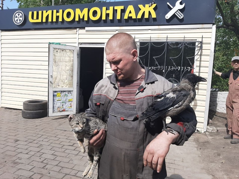 «Нам и втроем хорошо живется»: Как ворона с кошкой сделали автослесаря из Петербурга звездой интернета