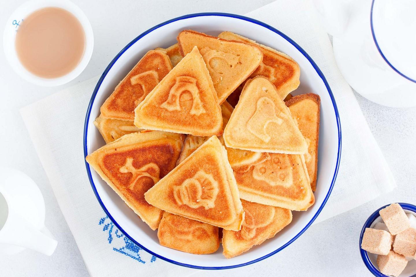 - Шаг 1: Подготовьте указанные ингредиенты. Такое печенье раньше готовилось только с маргарином, но его можно заменить на сливочное масло (с маслом ни разу не готовила). Маргарин берите проверенного производителя. Маргарин порежьте кубиками и предварительно растопите на водяной бане, оставьте на столе остывать. Яйца категории СО. Муки у меня получилось 160 гр - 1.5 стакана, может потребоваться чуть больше.Шаг 2: Куриные яйца промойте холодной водой, обсушите. Разбейте яйца по одному в глубокую миску, добавьте сахар и размешайте до соединения ингредиентов.Шаг 3: Влейте к яйцам охлаждённый растопленный маргарин и пермешайте.Шаг 4: Всыпьте муку, соду гашёную уксусом и замесите однородное густое тесто. По консистенции оно должно быть чуть гуще, чем тесто на оладьи. Такое тесто должно быть удобно накладывать ложкой.Шаг 5: Форму для печенья поставьте на огонь и дайте ей полностью нагреться. Половником выложите тесто на середину одной половины формы и закройте второй половиной, не прижимая. Поставьте на огонь и жарьте сначала с одной стороны до румяного цвета.Шаг 6: Затем форму переверните на другою сторону и жарьте с другой стороны. Когда форма разогреется очень хорошо, достаточно будет меньше минуты на каждую сторону. Огонь сделайте чуть меньше среднего, чтобы форма у вас не стала гореть и коптить из-за вытекающего жира и теста. Всего у меня получилось сделать шесть заходов с этим количеством теста.Шаг 7: Готовое печенье сразу выкладывайте на тарелку с салфетками или бумажным полотенцем. Пока оно горячее, вы можете его разрезать на отдельные сегменты - в моей форме это треугольники. Остывшее печенье можете переложить в красивое блюдо или сухарницу и подать к столу.