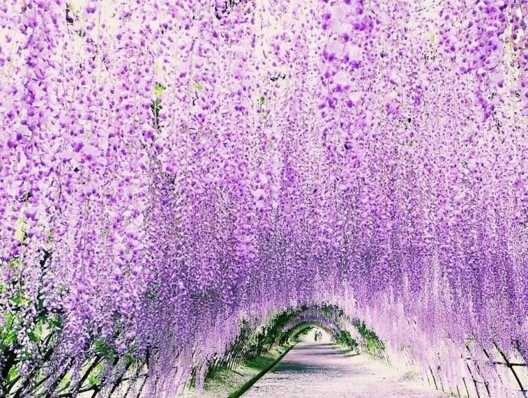 КИТАКЮСЮ, ЯПОНИЯ Глициниевый Туннель Практически невозможно пройти через проход пастельных тонов цветов глицинии в садах Кавачи Фудзи в Китакюсю, не представив себе изящную сказочную принцессу и ее однорогого белого коня, скачущего рядом с тобой. Из семейства гороховых, глициния - декоративная виноградная лоза, широко используемая в восточных и западных садах благодаря своим изящным висящим цветам и изящным извилистым ветвям. Легко подготовленные, древесные лозы имеют тенд...
