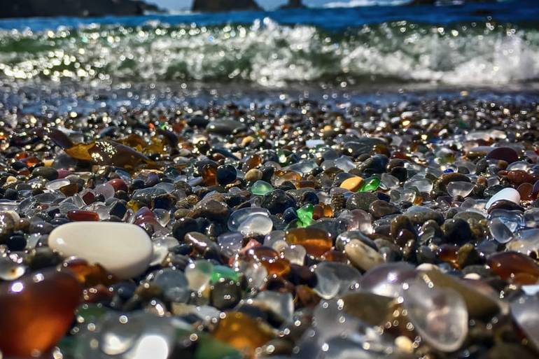 Стеклянный пляж (Glass Beach) Это название — не метафора: пляж действительно был покрыт множеством стеклянных камешков, хотя в настоящее время их уже значительно меньше, чем на фото. Тем не менее, пляж по-прежнему является достопримечательностью города. Местные жители многие годы использовали этот пляж как свалку: выбрасывали бытовые отходы, старую бытовую технику, автомобили, стекло.