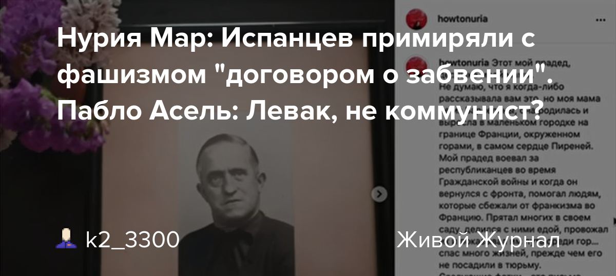 Нурия Мар: Испанцев примиряли с фашизмом "договором о забвении". Пабло Асель: Левак, не коммунист? Политическая пропаганда. Для меня уже так повелось, что если апрель - это месяц о космонавтике и атомной энергетике, то май - месяц постов о войне и пропаганде на военную тему. Пока выдался свободный день, распишу еще одну тему о том, как на Западе усмиряют любое левое (а не левацкое…