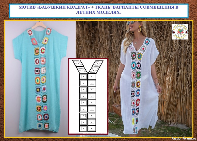 МОТИВ «БАБУШКИН» КВАДРАТ + ТКАНЬ! ВАРИАНТЫ СОВМЕЩЕНИЯ В ЛЕТНИХ МОДЕЛЯХ. | Женская одежда крючком. Схемы и описание