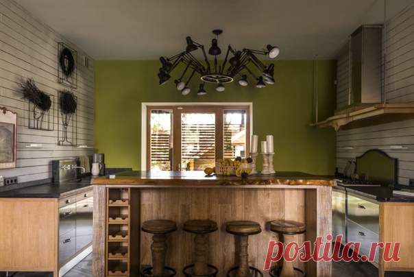 Параллельная кухня в стиле лофт с плоскими фасадами, фасадами из нержавеющей стали, белым фартуком, фартуком из дерева, островом, черной столешницей и серым полом