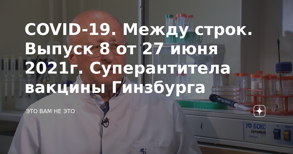 COVID-19. Между строк. Выпуск 8 от 27 июня 2021г. Суперантитела вакцины Гинзбурга Вчера в телевизионном интервью мэр Москвы Сергей Семенович Собянин укололся некоей (как обычно не упомянутой) вакциной, от которой у него моментально "антитела зашкалили", сегодня на линии господин Гинзбург. Тот самый руководитель того самого суперинститута им. Гамалеи, который в кратчайшие сроки создал супервакцину, и доложил генеральному секретарю ЦК КПСС товарищу... ой ой, простите пожалуй...