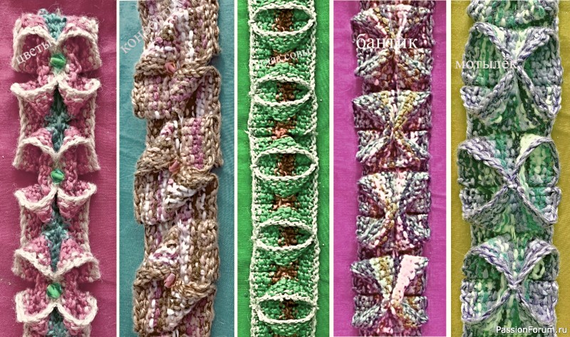 Модульные ленты из рюшевых полос. | Вязание для женщин спицами. Схемы вязания спицами Вязаная полоска, собранная по принципу рюша,-даёт массу вариантов модульных лент.Эти ленты затем способны воплощаться в шарфики, гирлянды, подвески для штор, и т.д.