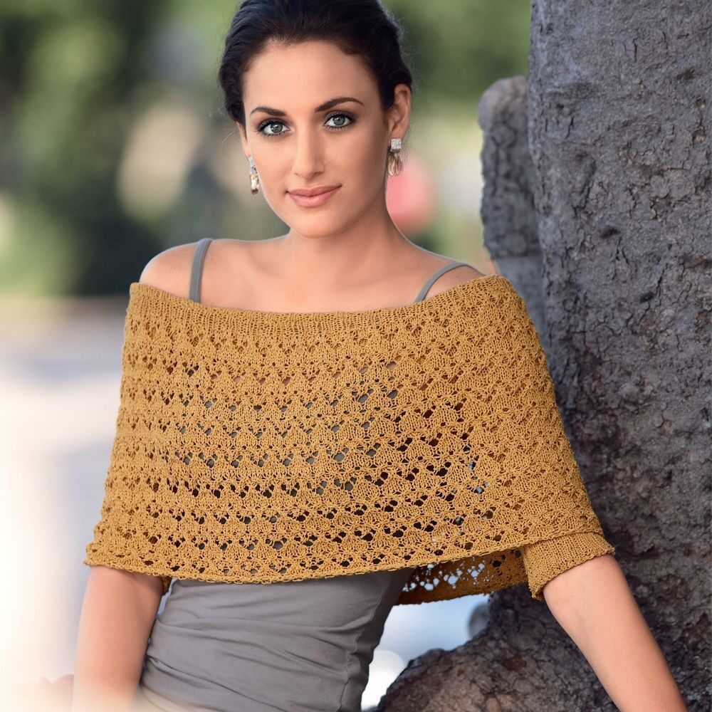 Ажурное болеро с открытыми плечами Интригующая и оригинальная модель для торжественных случаев. Она несложна в исполнении, необычна и очень элегантна. Размер Обхват 108 см, высота 29 см ВАМ ПОТРЕБУЕТСЯ Пряжа (55% хлопка, 25% полиамида, 20% шелка; 125 м/50 г) — 300 г золотисто-желтой; спицы №3; круговые спицы №3 и 3,5 длиной по 80 см. УЗОРЫ И СХЕМЫ ЛИЦЕВАЯ ГЛАДЬ Лицевые ряды — лицевые петли, изнаночные ряды — изнаночные петли. РЕЗИНКА Попеременно 2 лиц., 2 изн. А...